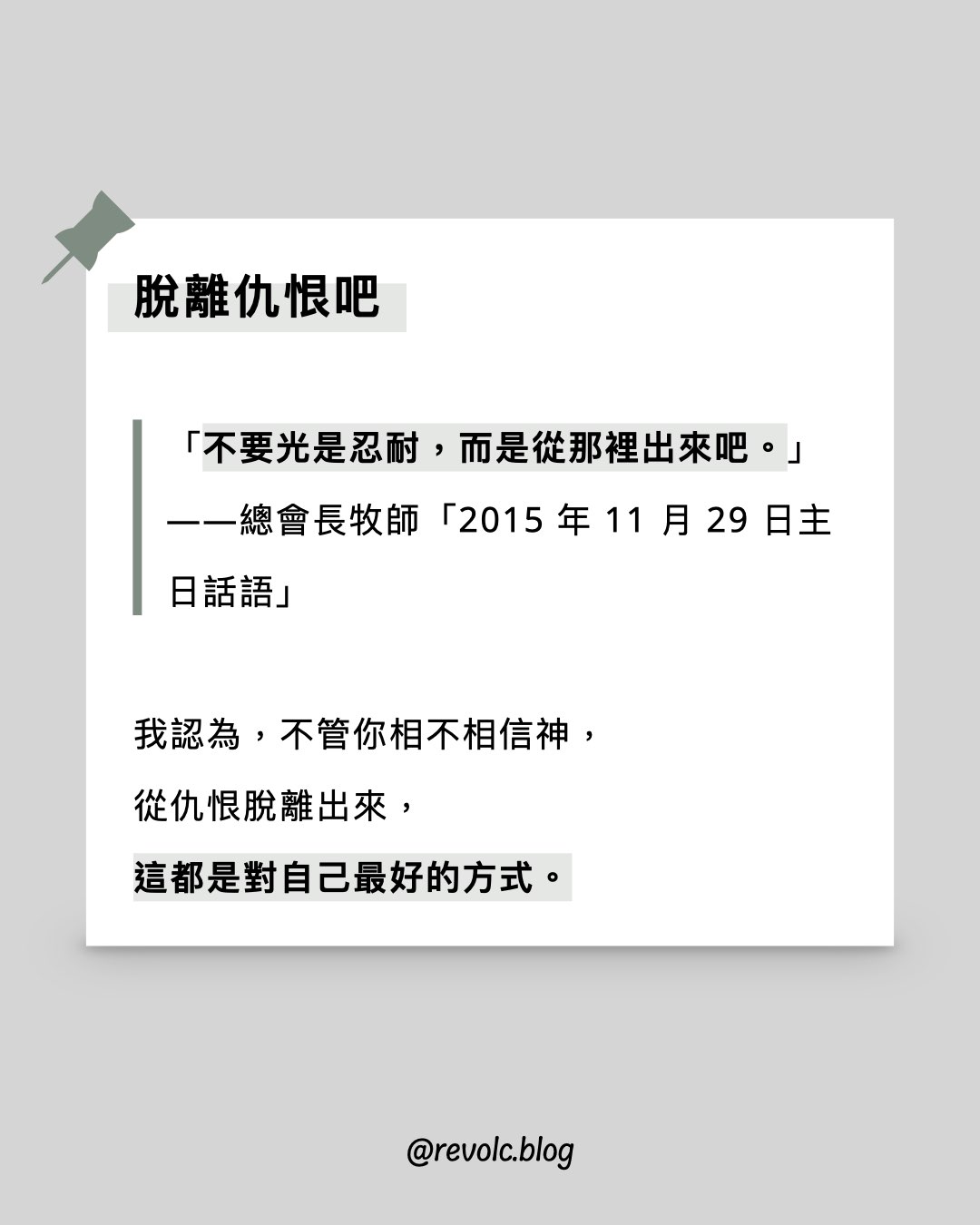 現在我的心,好像很認識「仇恨」這種情緒了。一旦仇恨的警報聲在心中響起,我就立刻選擇脫離並原諒。