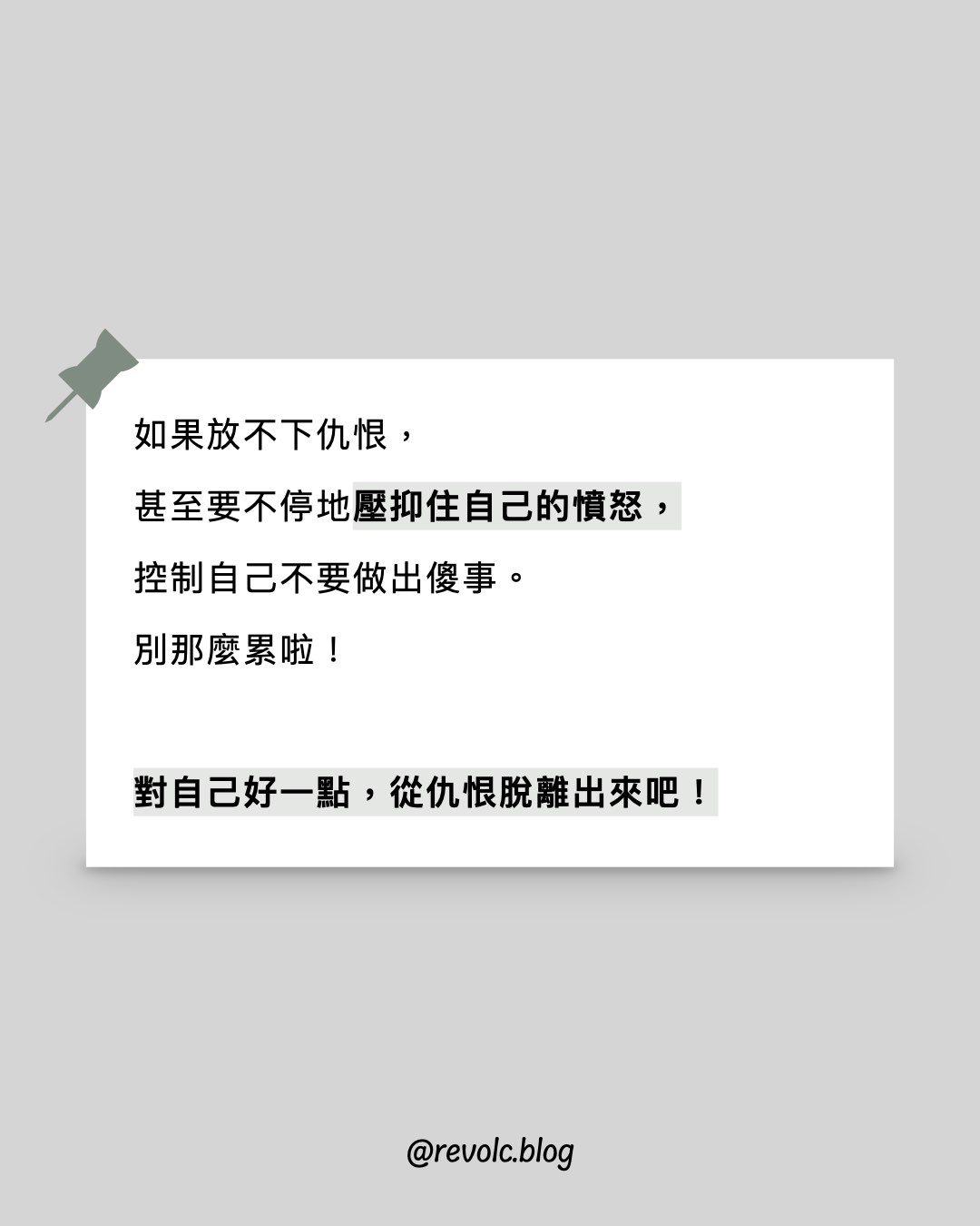 如果放不下仇恨,甚至要不停地壓抑住自己的憤怒,控制自己不要做出傻事。別那麼累啦!