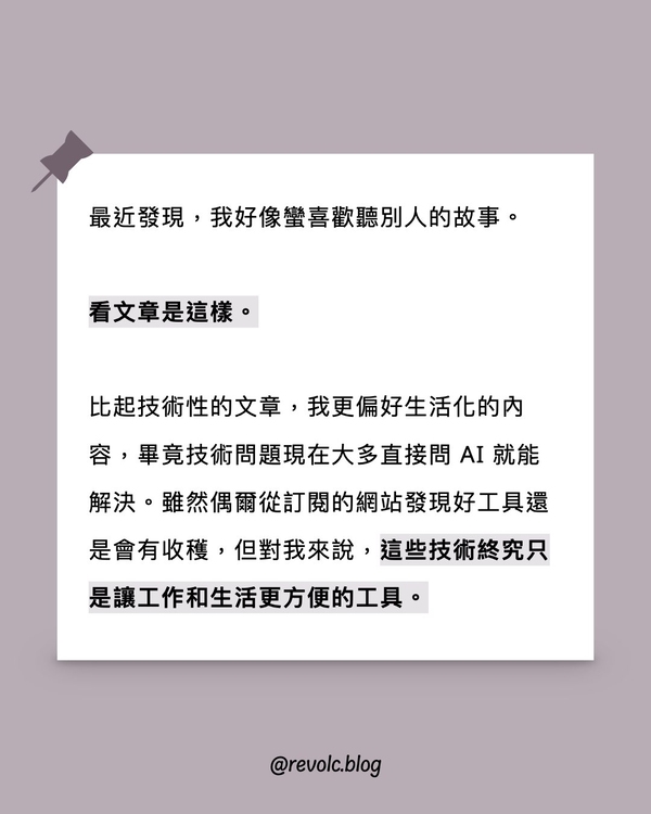 比起技術性的文章,我更偏好生活化的內容,畢竟技術問題現在大多直接問 AI 就能解決。雖然偶爾從訂閱的網站發現好工具還是會有收穫,但對我來說,這些技術終究只是讓工作和生活更方便的工具。