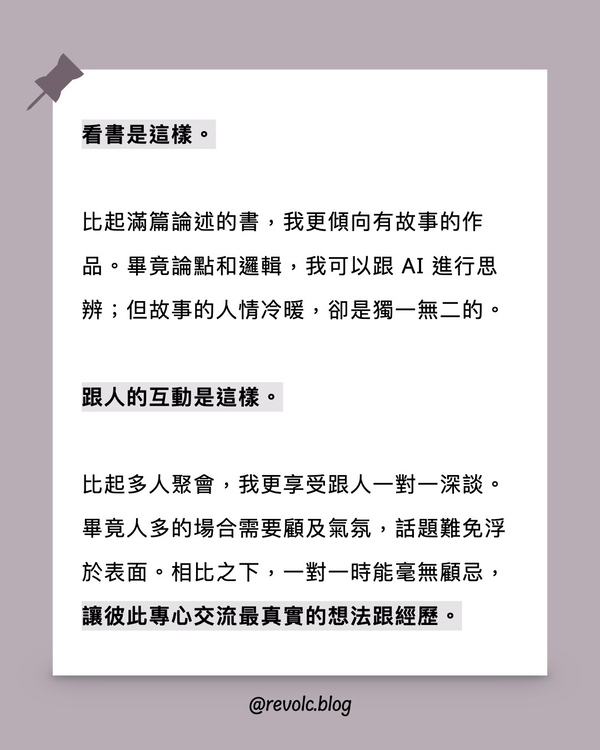 比起滿篇論述的書,我更傾向有故事的作品。畢竟論點和邏輯,我可以跟 AI 進行思辨;但故事的人情冷暖,卻是獨一無二的。