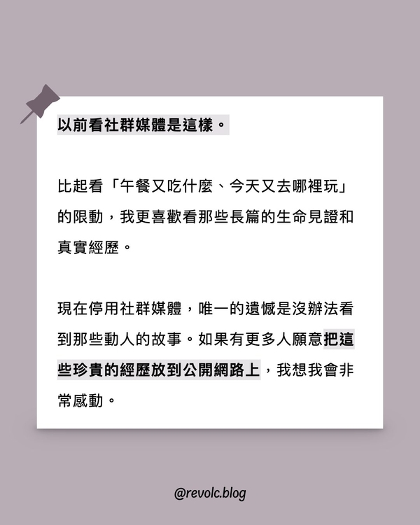 現在停用社群媒體,唯一的遺憾是沒辦法看到那些動人的故事。如果有更多人願意把這些珍貴的經歷放到公開網路上,我想我會非常感動。
