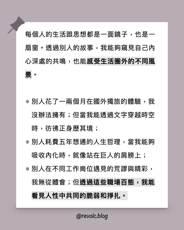 每個人的生活跟思想都是一面鏡子,也是一扇窗。透過別人的故事,我能夠窺見自己內心深處的共鳴,也能感受生活圈外的不同風景。