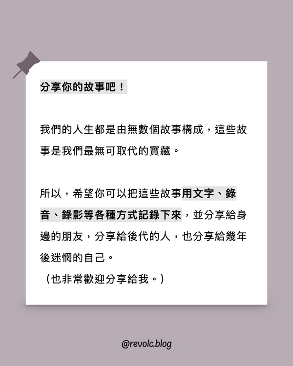 所以,希望你可以把這些故事用文字、錄音、錄影等各種方式記錄下來,並分享給身邊的朋友,分享給後代的人,也分享給幾年後迷惘的自己。