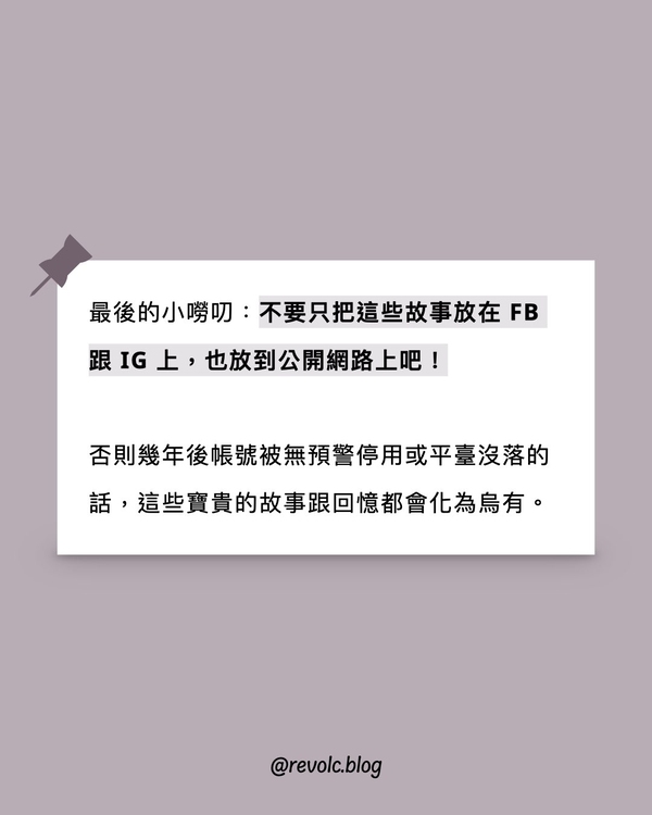 最後的小嘮叨:不要只放在 FB 跟 IG 上,也放到公開網路上吧!否則幾年後帳號被無預警停用或平臺沒落的話,這些寶貴的故事跟回憶都會化為烏有。