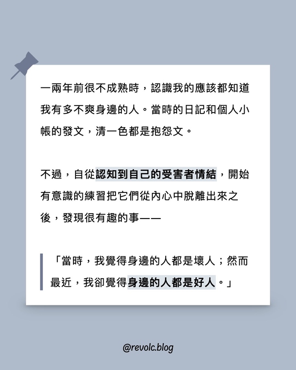 不過,自從認知到自己的受害者情結,開始有意識的練習把它們從內心中脫離出來之後,發現很有趣的事——