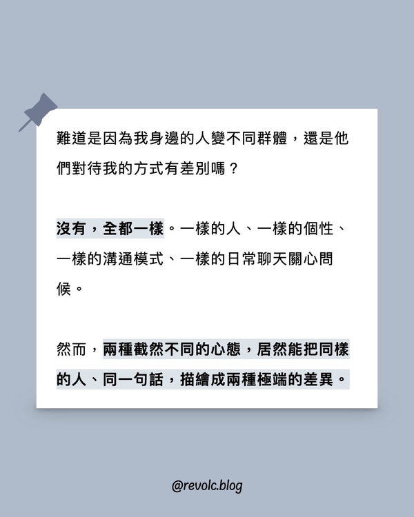 難道是因為我身邊的人變不同群體,還是他們對待我的方式有差別嗎?沒有,全都一樣。一樣的人、一樣的個性、一樣的溝通模式、一樣的日常聊天關心問候。