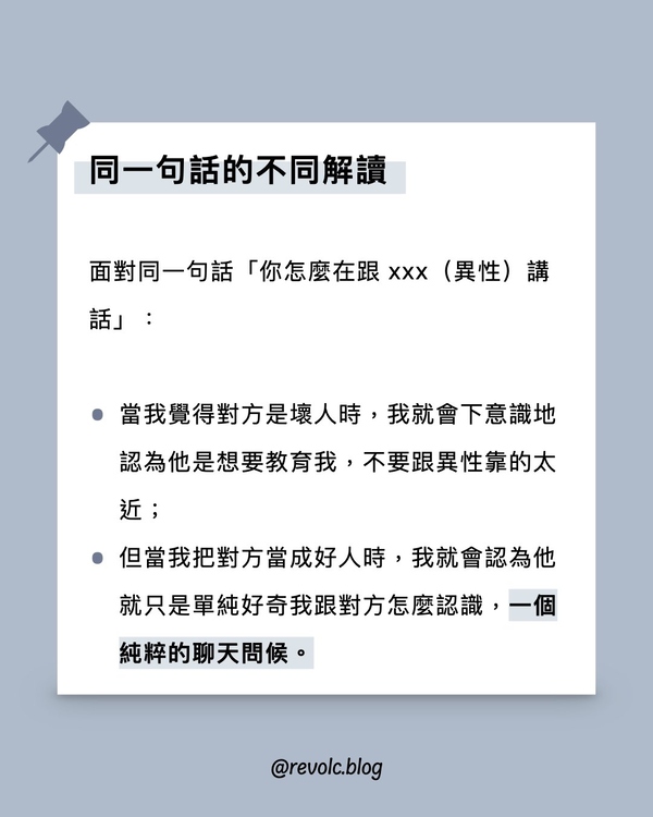 - 但當我把對方當成好人時,我就會認為他就只是單純好奇我跟對方怎麼認識,一個純粹的聊天問候。