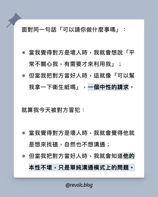 - 但當我把對方當好人時,我就會知道他的本性不壞,只是單純溝通模式上的問題。我想他也很想知道我的真實想法,所以我選擇跟他說這個語氣跟說話方式會冒犯到我。