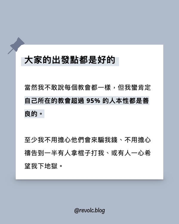 當然我不敢說每個教會都一樣,但我蠻肯定自己所在的教會超過 95% 的人本性都是善良的。至少我不用擔心他們會來騙我錢、不用擔心禱告到一半有人拿棍子打我、或有人一心希望我下地獄。