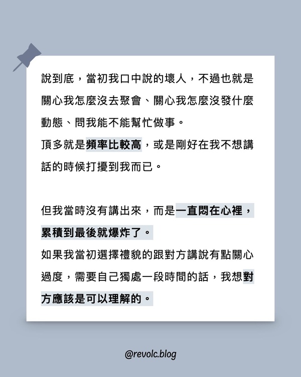 但我當時沒有講出來,而是一直悶在心裡,累積到最後就爆炸了。如果我當初選擇禮貌的跟對方講說有點關心過度,需要自己獨處一段時間的話,我想對方應該是可以理解的。