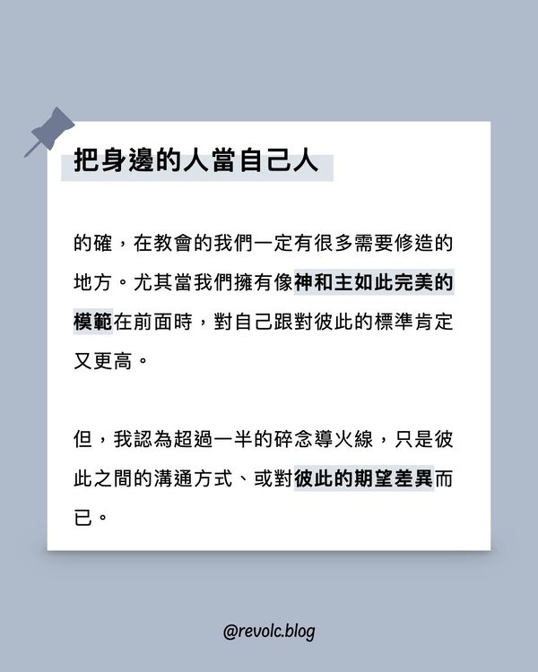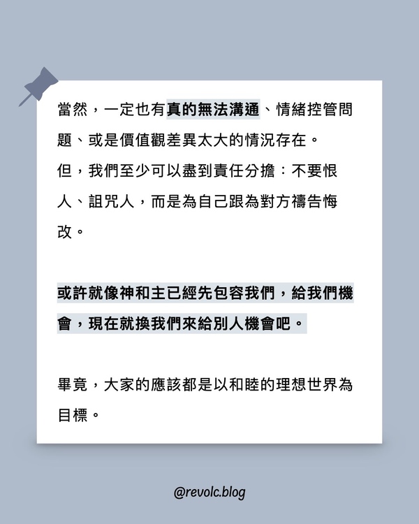 當然,一定也有真的無法溝通、情緒控管問題、或是價值觀差異太大的情況存在。但,我們至少可以盡到責任分擔:不要恨人、詛咒人,而是為自己跟為對方禱告悔改。