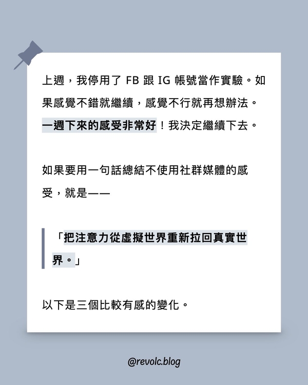 上週,我停用了 FB 跟 IG 帳號當作實驗。如果感覺不錯就繼續,感覺不行就再想辦法。