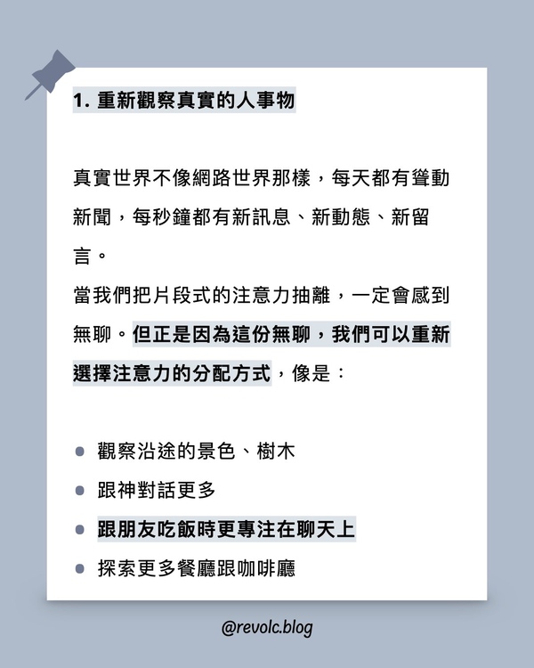 當我們把片段式的注意力抽離,一定會感到無聊。但正是因為這份無聊,我們可以重新選擇注意力的分配方式,像是: