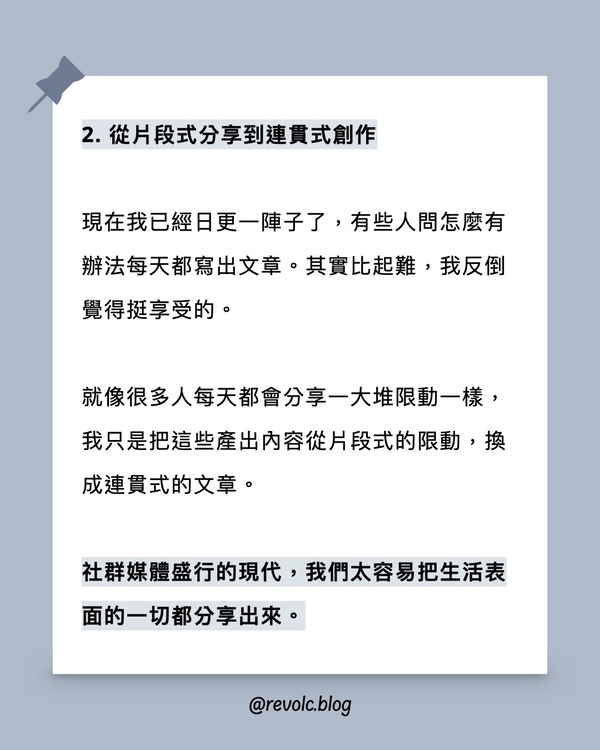 就像很多人每天都會分享一大堆限動一樣,我只是把這些產出內容從片段式的限動,換成連貫式的文章。