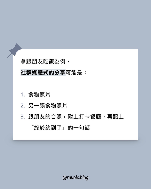 拿跟朋友吃飯為例,社群媒體式的分享可能是: