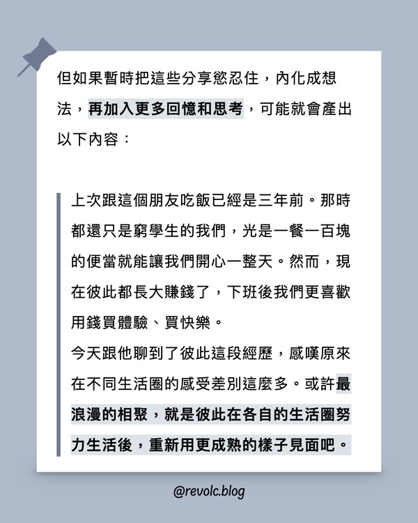 但如果暫時把這些分享慾忍住,內化成想法,再加入更多回憶和思考,可能就會產出以下內容: