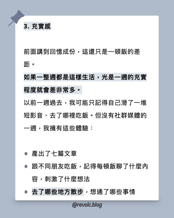 以前一週過去,我可能只記得自己滑了一堆短影音、去了哪裡吃飯。但沒有社群媒體的一週,我擁有這些體驗: