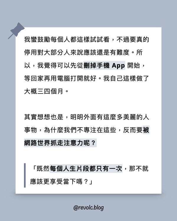 我蠻鼓勵每個人都這樣試試看,不過要真的停用對大部分人來說應該還是有難度。所以,我覺得可以先從刪掉手機 App 開始,等回家再用電腦打開就好。我自己這樣做了大概三四個月。