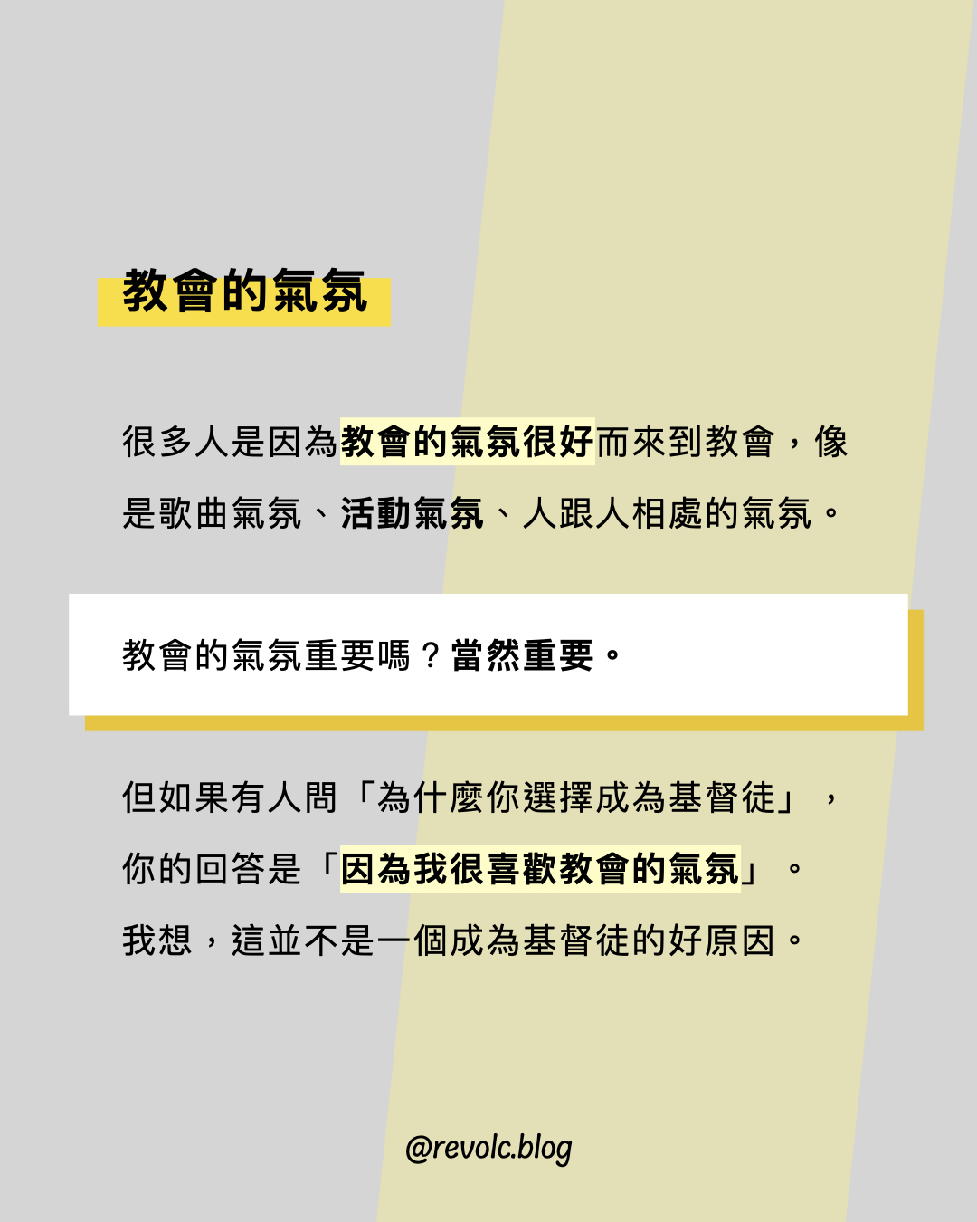但如果今天有人問你說「為什麼你選擇成為基督徒」,你的回答是「因為我很喜歡教會的氣氛」。我想,這並不是一個成為基督徒的好原因。