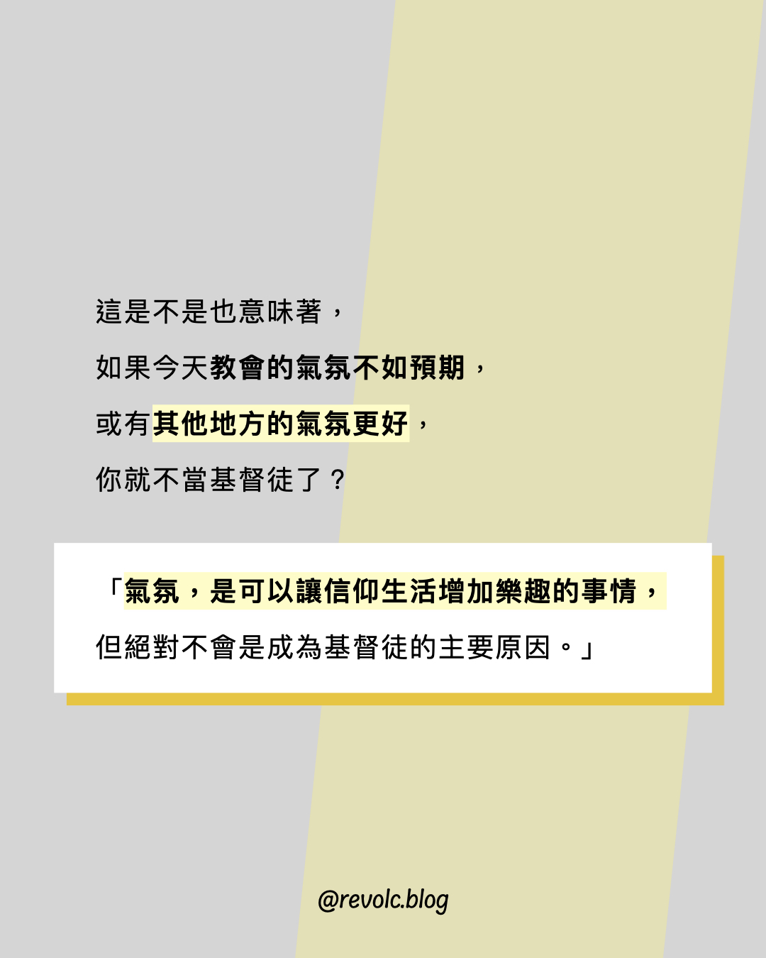這是不是也意味著,如果今天教會的氣氛不如預期,或有其他地方的氣氛更好,你就不當基督徒了?