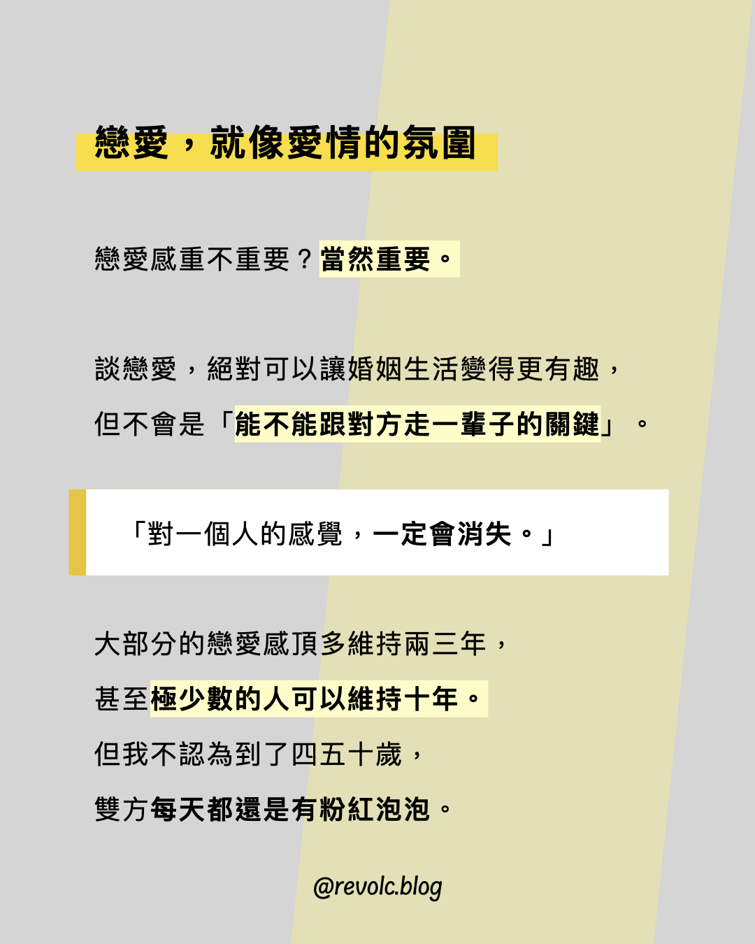 有的戀愛感可以維持兩三年,甚至極少數的人可以維持十年。但我不認為到了四五十歲,雙方每天都還是有粉紅泡泡。