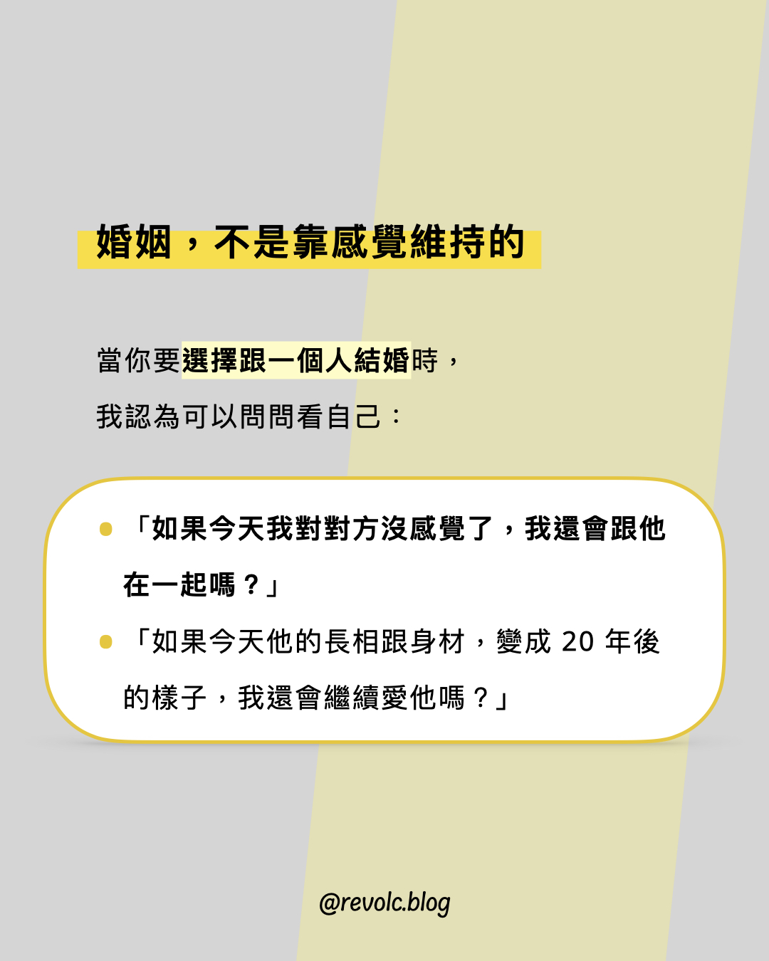 當你要選擇跟一個人結婚時,我認為可以問問看自己: