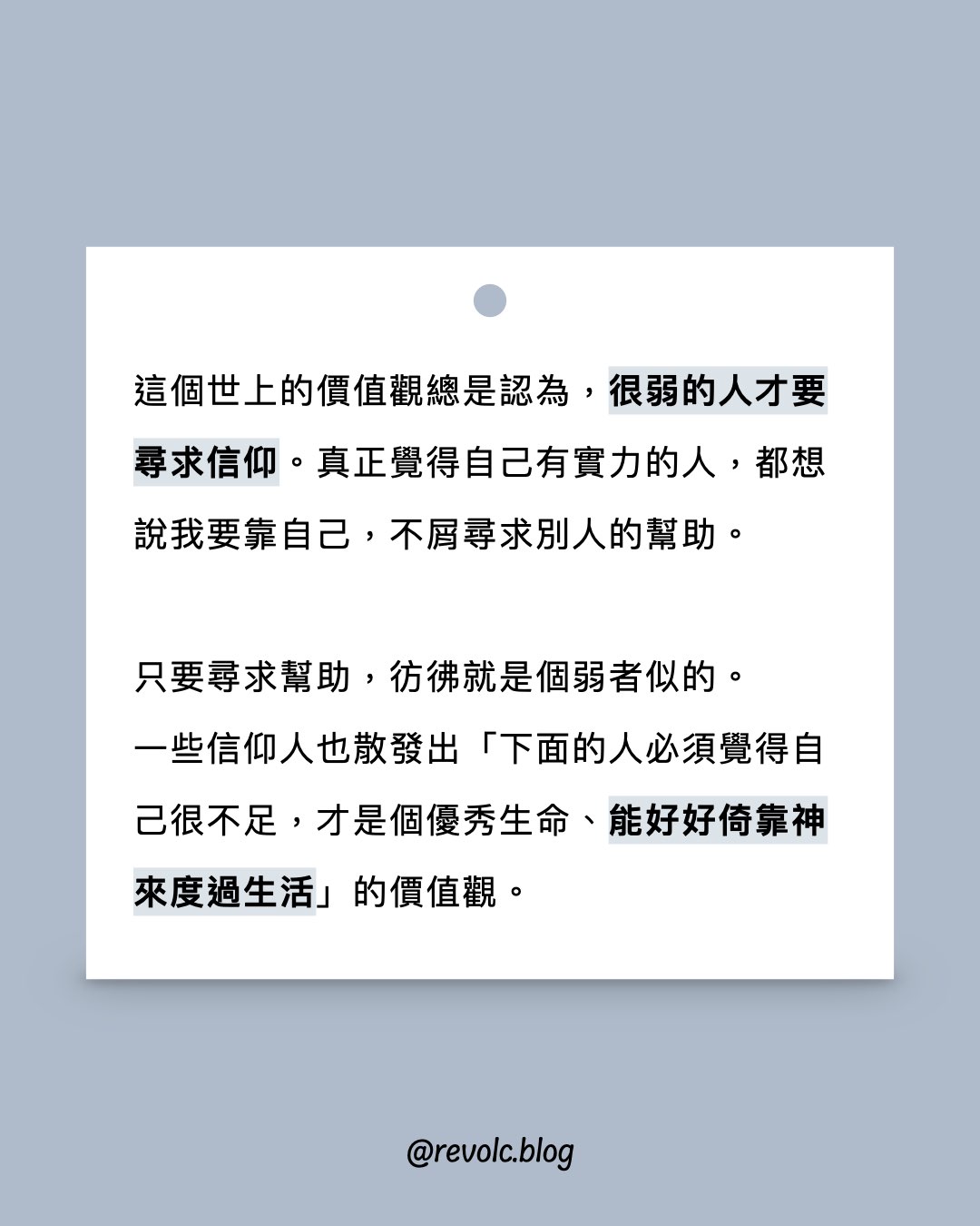 只要尋求幫助,彷彿就是個弱者似的。身邊接觸到的一些信仰人也有散發出這個價值觀,好像一定要下面的人覺得自己很不足,才是個優秀生命,才能好好倚靠神來度過生活。
