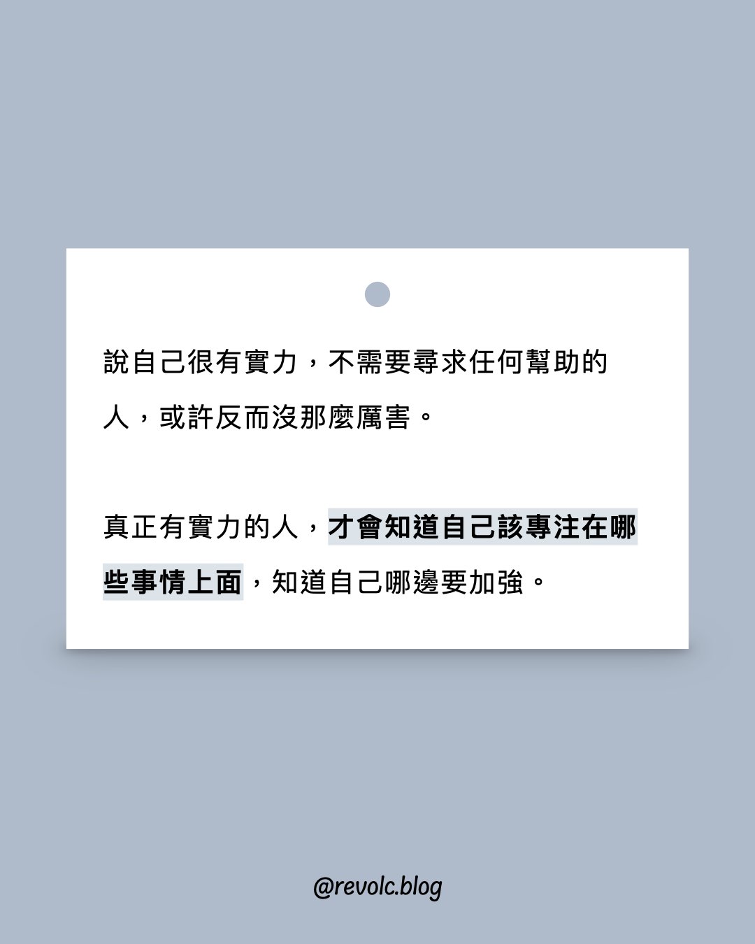 說自己很有實力,不需要尋求任何幫助的人,或許反而沒那麼厲害。真正有實力的人,才會知道自己該專注在哪些事情上面,知道自己哪邊要加強。