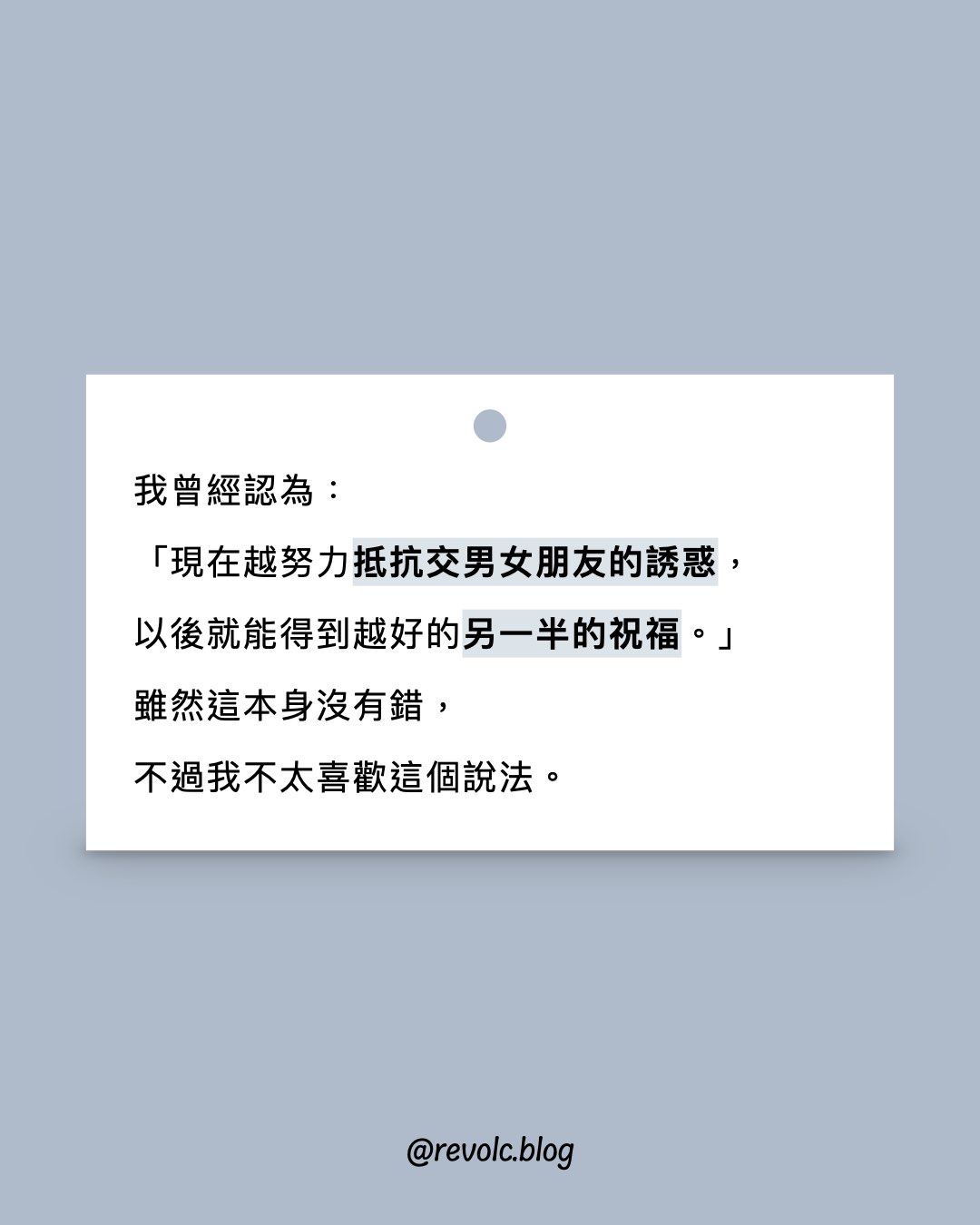 「現在越努力抵抗交男女朋友的誘惑,以後就能得到越好的另一半的祝福。」