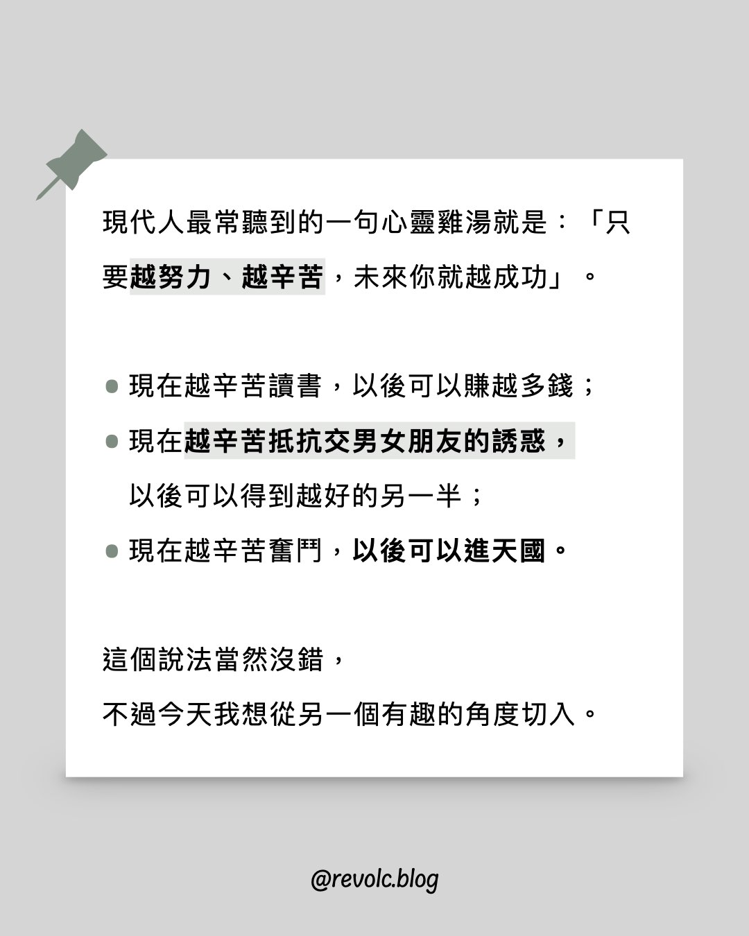現代人最常聽到的一句心靈雞湯就是:「只要越努力、越辛苦,未來你就越成功」: