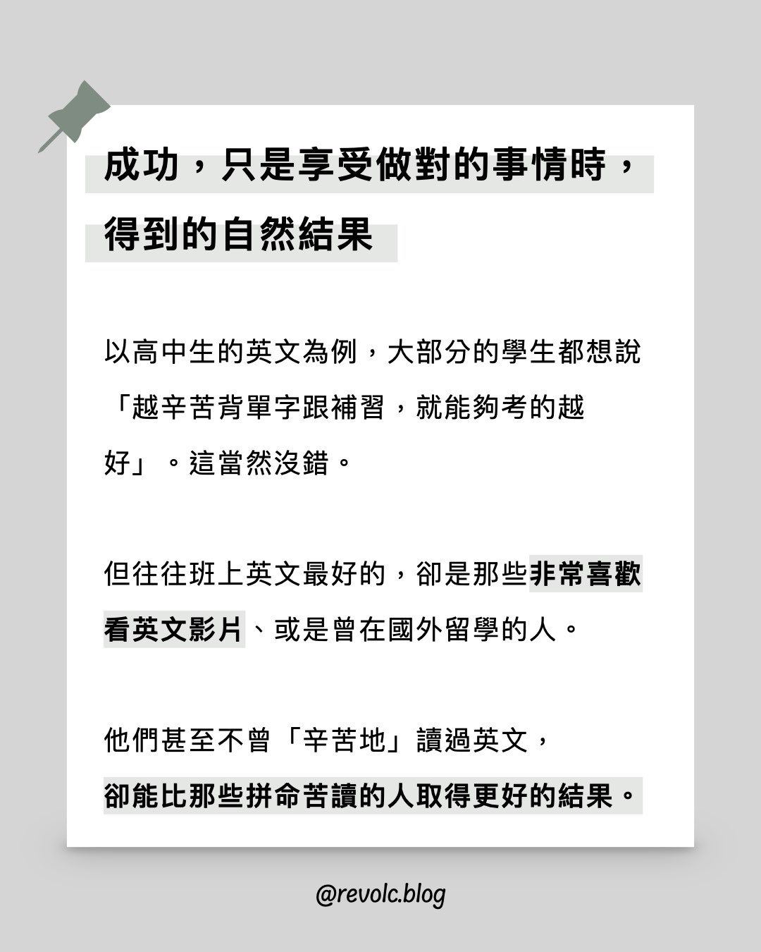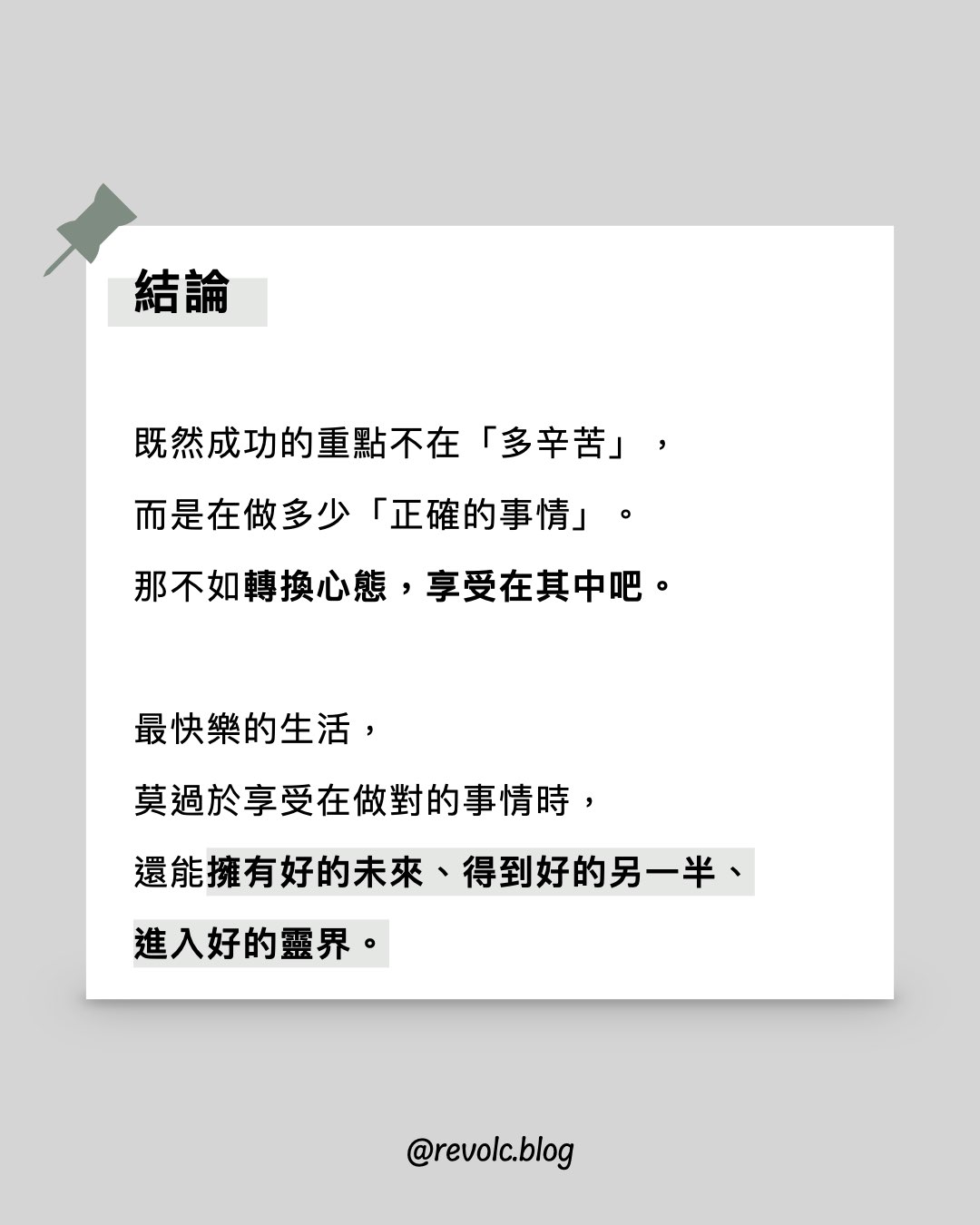 既然成功的重點不在「多辛苦」,而是在做多少「正確的事情」。那不如轉換心態,享受在其中吧。