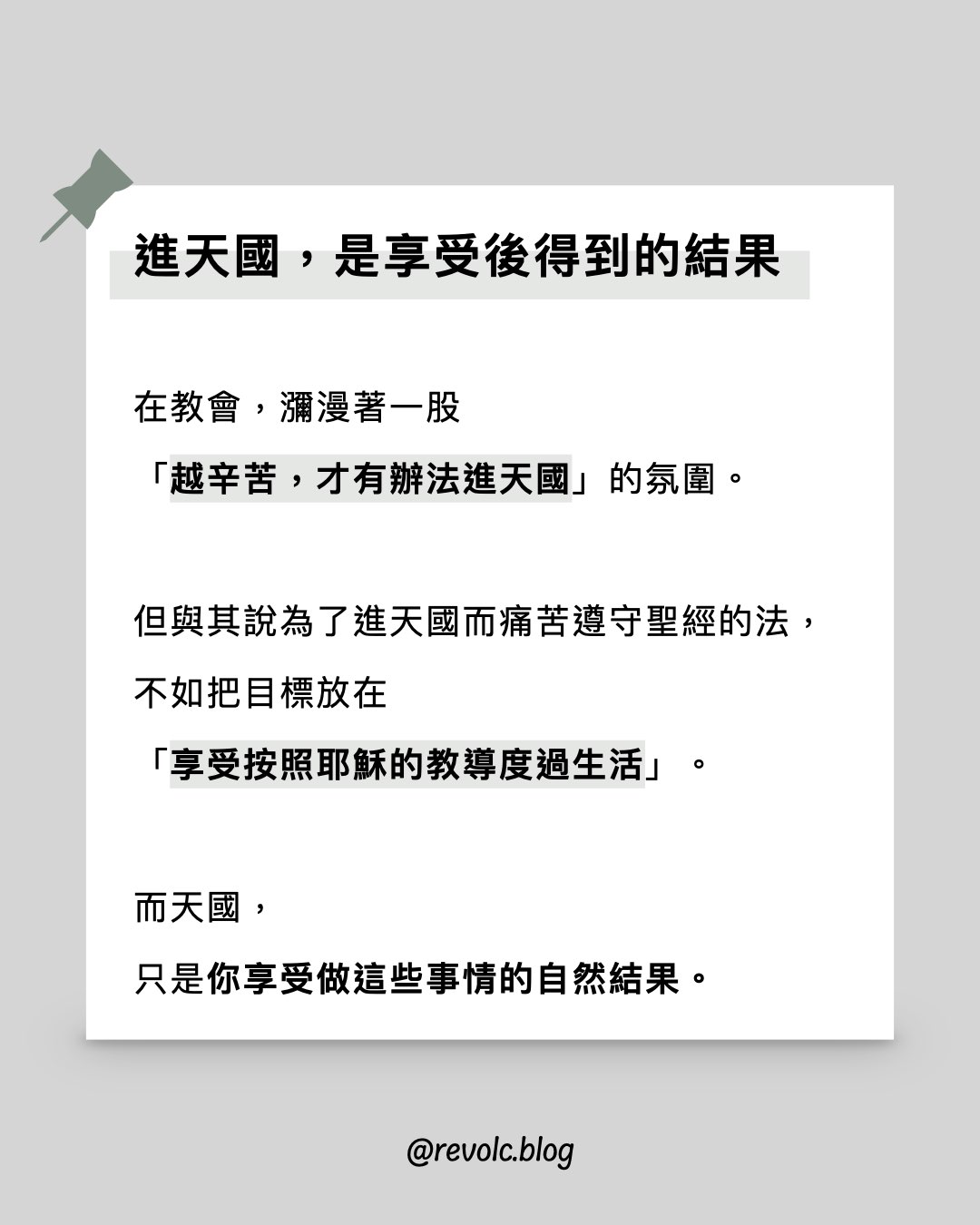 但與其說為了進天國而痛苦遵守聖經的法,不如把目標放在「享受按照耶穌的教導度過生活」。