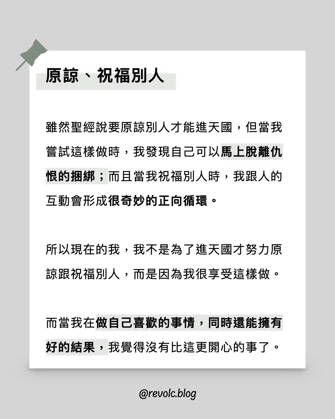 所以現在的我,我不是為了進天國才努力原諒跟祝福別人,而是因為我很享受這樣做。