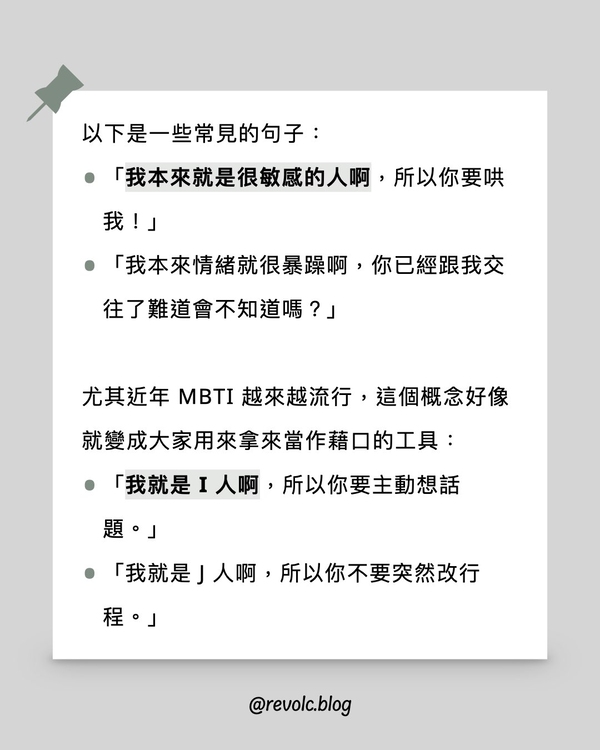 尤其近年 MBTI 越來越流行,這個概念好像就變成大家用來拿來當作藉口的工具: