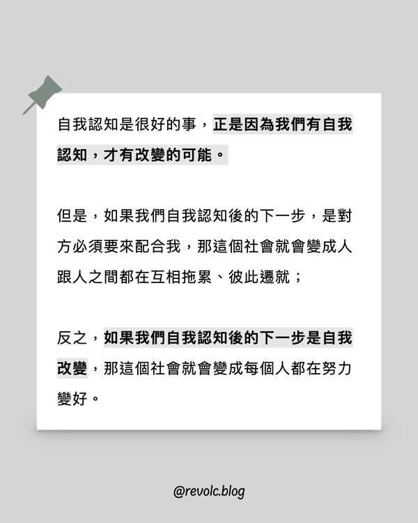 但是,如果我們自我認知後的下一步,是對方必須要來配合我,那這個社會就會變成人跟人之間都在互相拖累、彼此遷就;反之,如果我們自我認知後的下一步是自我改變,那這個社會就會變成每個人都在努力變好。