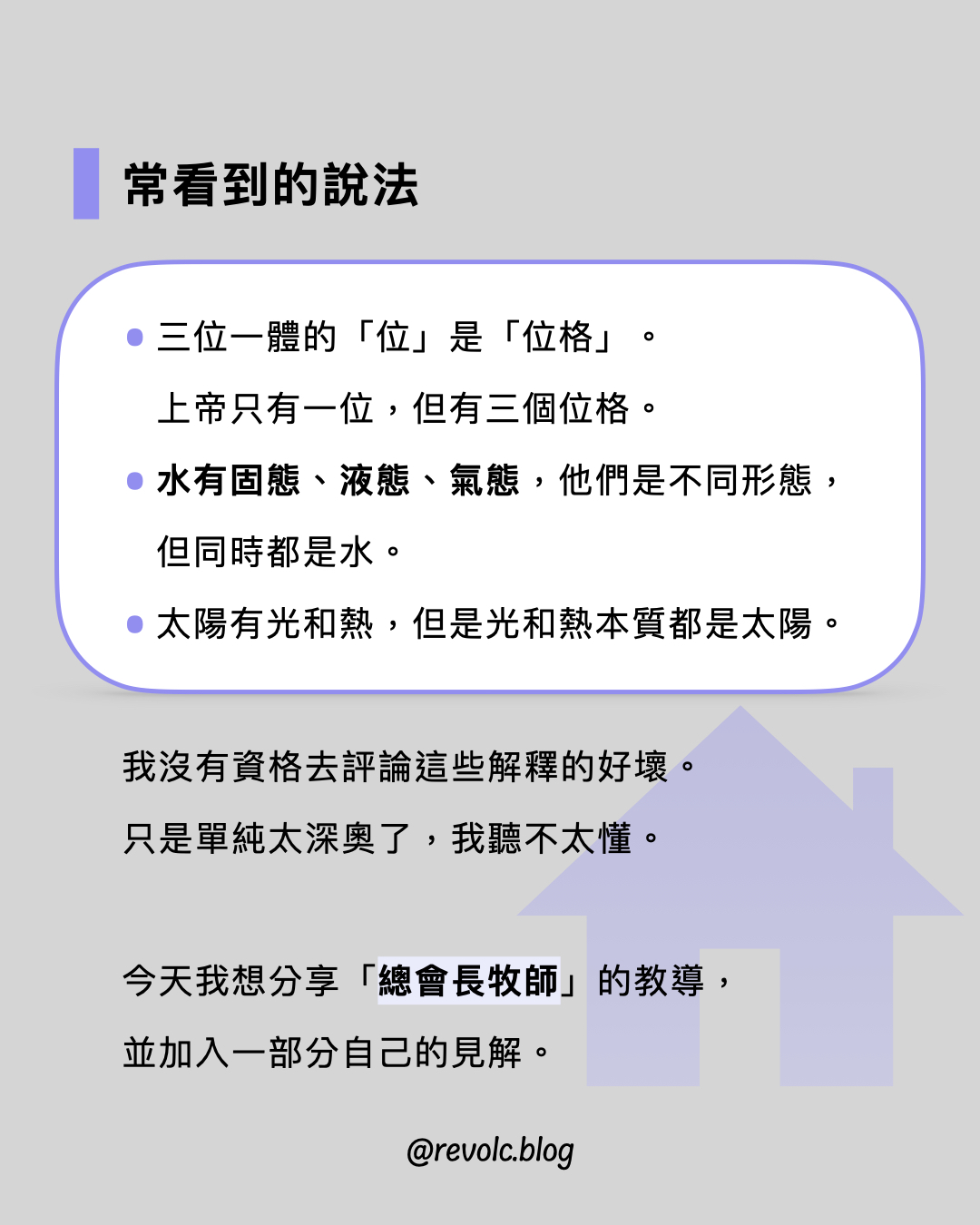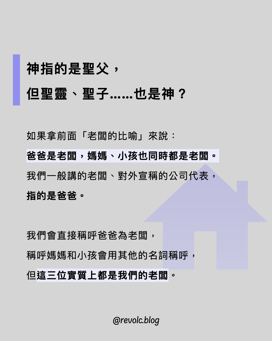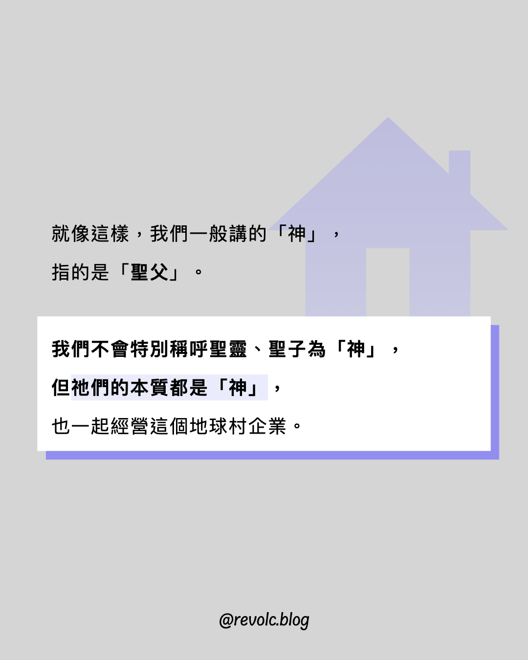 就像這樣,我們一般講的「神」,指的是「聖父」。我們不會特別稱呼「聖靈」、「聖子」為「神」,但祂們的本質都是「神」,也一起經營這個地球村企業。