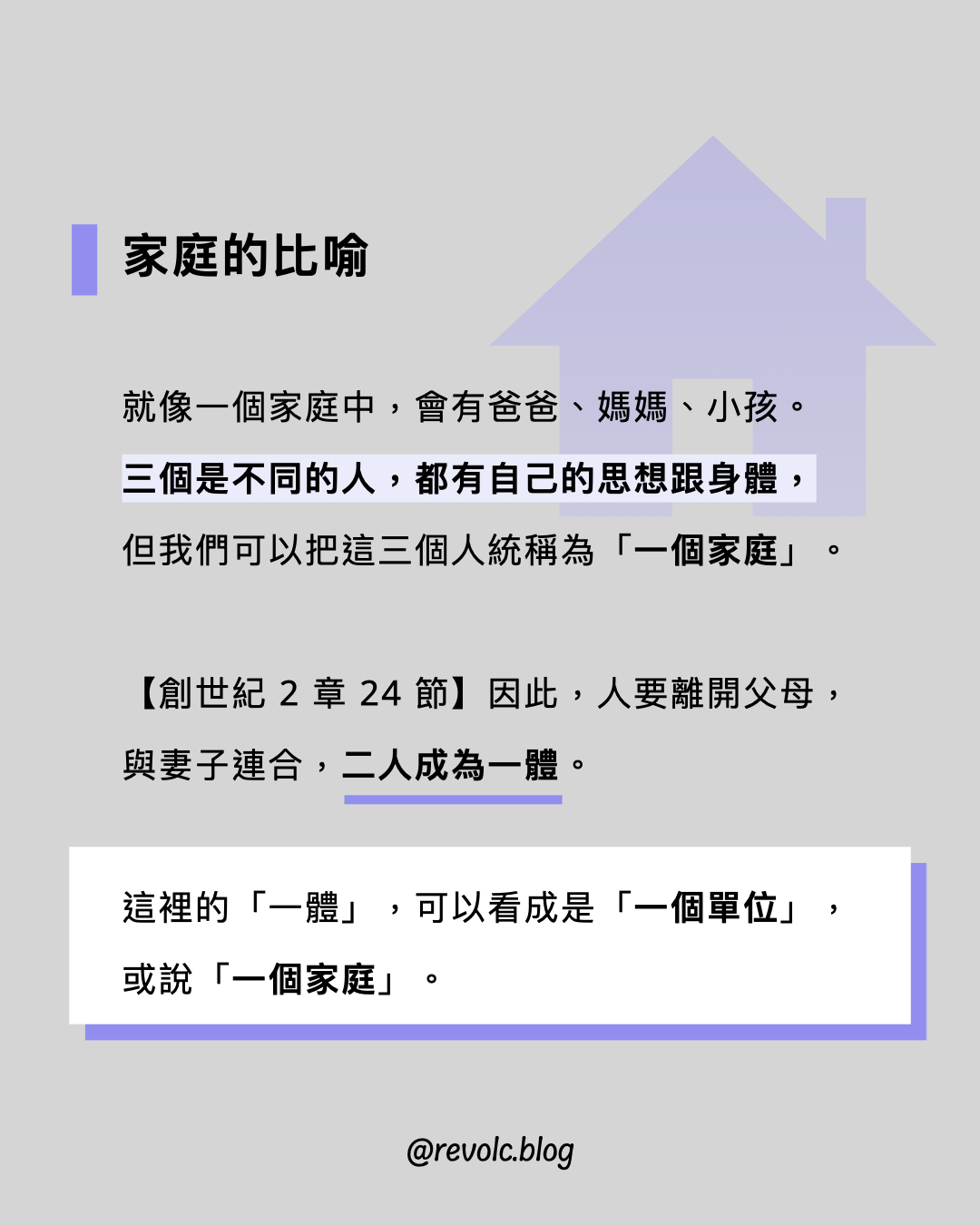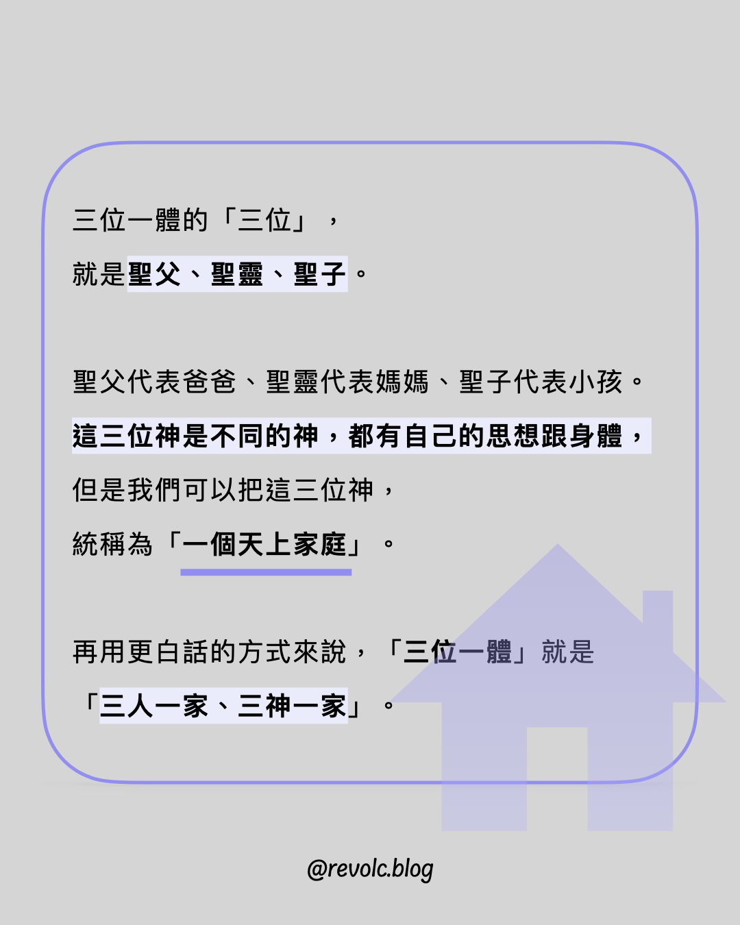再用更白話的方式來說,可以把「三位一體」解釋成「三人一家」、「三神一家」。