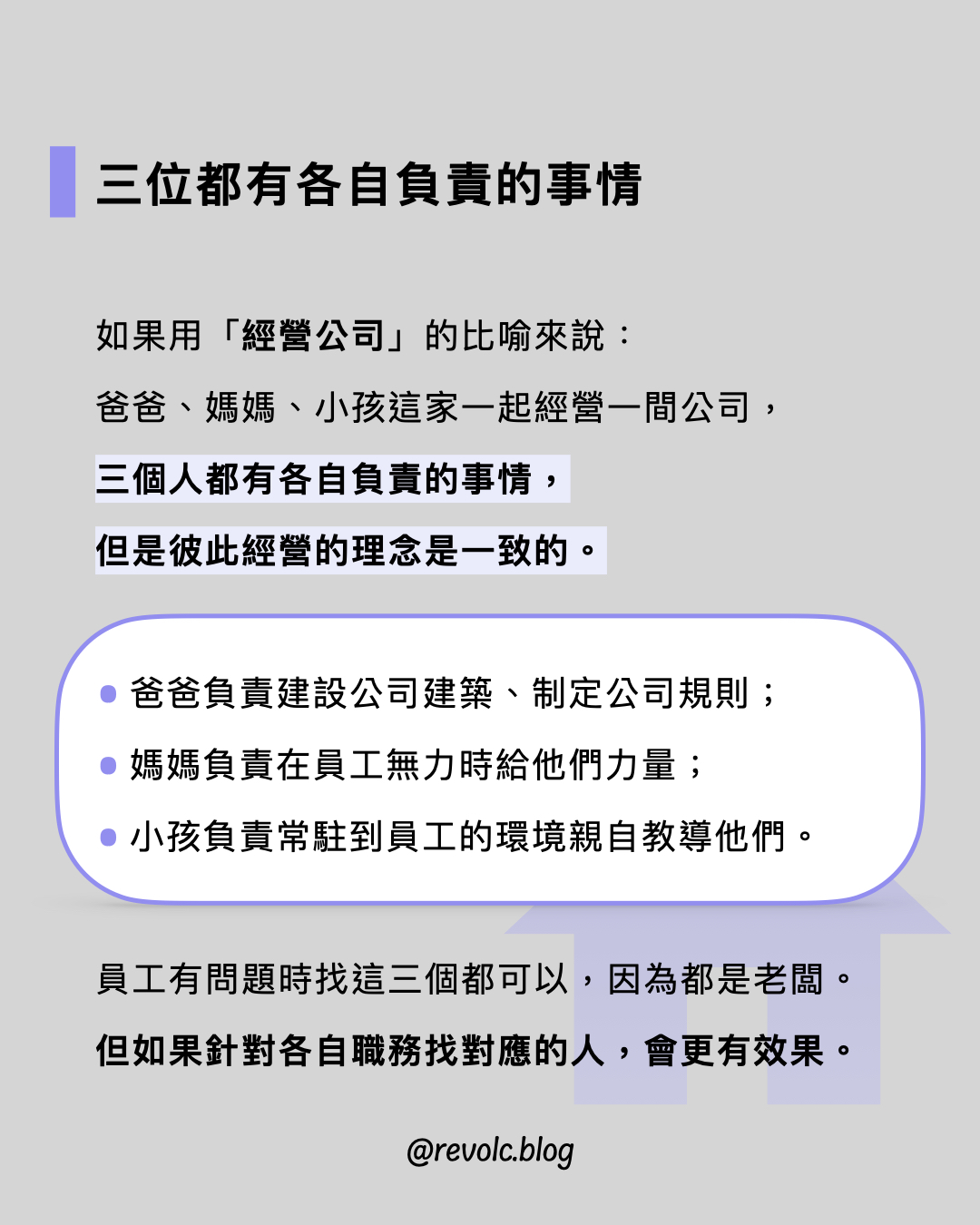 當員工有問題時,找這三個都可以,因為他們都是老闆。但是如果針對各自的職務去找對應的人,會更有效果。