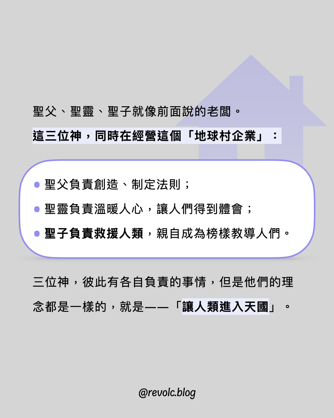 聖父、聖靈、聖子就像前面說的老闆。這三位神,同時在經營這個「地球村企業」: